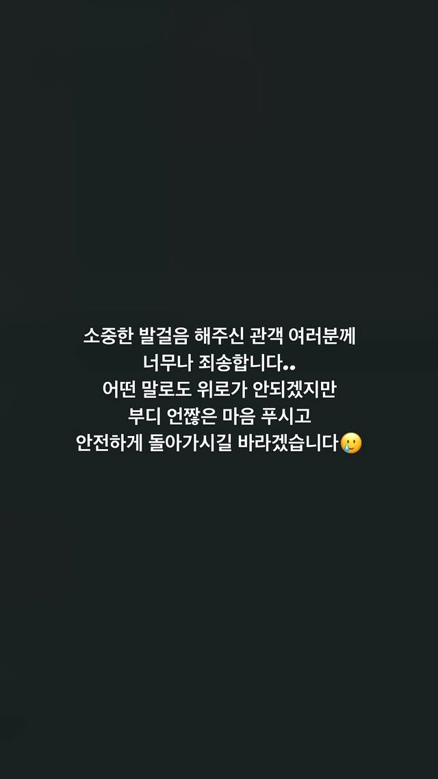 '스윙 데이즈_암호명 A' 해당 공연에 출연한 민우혁 역시 "소중한 발걸음 해주신 관객 여러분께 너무나 죄송합니다. 어떤 말로도 위로가 안 되겠지만 부디 언짢은 마음 푸시고 안전하게 돌아가시길 바라겠습니다"라며 양해를 구했다.