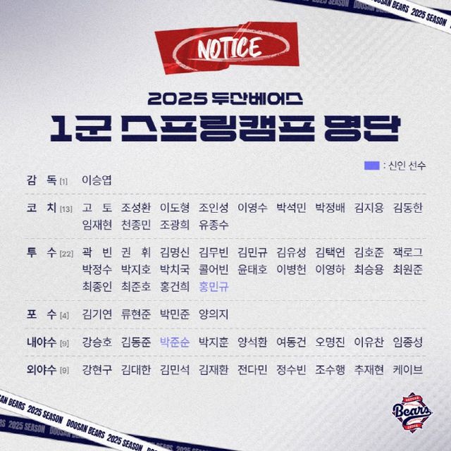 캠프 인원은 이승엽 감독을 포함한 코칭스태프 13명과 선수단 44명 등 총 57명이다. 투수 22명, 포수 4명, 내야수 9명, 외야수 9명이 참가한다. 신인 중에서는 1라운드 지명자 내야수 박준순과 3라운드 지명자 투수 홍민규가 이름을 올렸다.