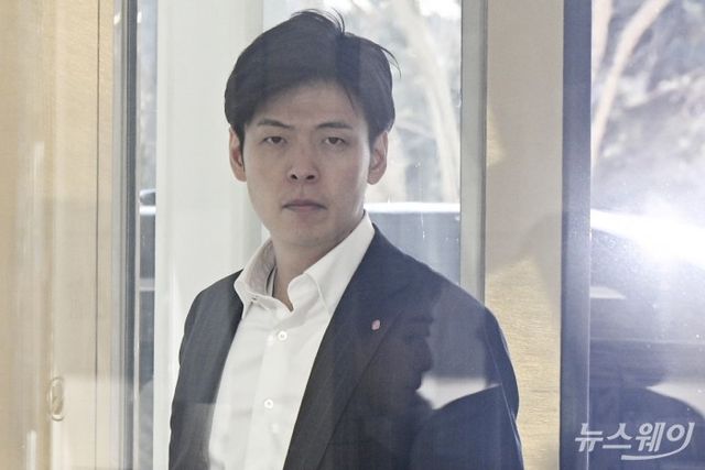 신동빈 롯데그룹 회장의 장남인 신유열 롯데지주 부사장이 9일 오전 서울 송파구 롯데월드타워에서 열린 2025 상반기 VCM(Value Creation Meeting·옛 사장단 회의)에 참석하기 위해 회의장으로 들어서고 있다. 사진=강민석 기자 kms@newsway.co.kr