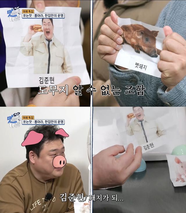 황제성은 “나 진짜 뽑기 잘했다”며 자신감을 보였으나 한 번에 3개를 뽑아 멤버들에게 잔소리를 듣는다. 각자 하나씩 뽑기를 선택한 상황에서 첫 번째 사진은 김준현 얼굴이 나와 궁금증을 자아낸다. 이후 돼지 사진들이 줄줄이 공개되고 김준현은 “기분이 좀 이상한데?”라며 찝찝한 표정을 짓는다.