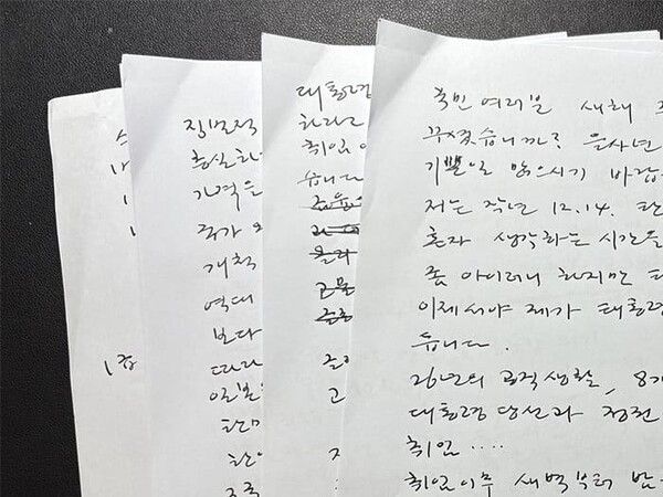 윤 대통령은 체포영장 집행 직후 페이스북을 통해 올해 초 육필로 작성한 글을 공개하기도 했다. 200자 원고지 44장에 달하는 분량이다. 윤 대통령 측은 ‘이 글은 새해 초 윤석열 대통령이 직접 만년필을 들고 밤새 작성한 국민께 드리는 글입니다. 육필 원고 그대로 올려드립니다’라고 설명했다.