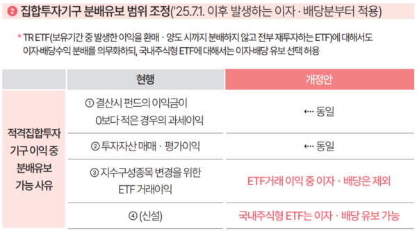 그러면서 "다른 소득세는 이연이 없으나 TR상품의 이자·배당소득만 이연을 해왔는데, 과세형평에 부합하지 않았다"며 "국내 TR은 대주주가 아니면 양도소득세가 없고, 해외 TR상품은 양도소득세가 부과되지만 운용 과정에서 이자·배당소득과 양도소득 부분이 손익통산돼 과세의 어려움이 있다"고 설명했다.