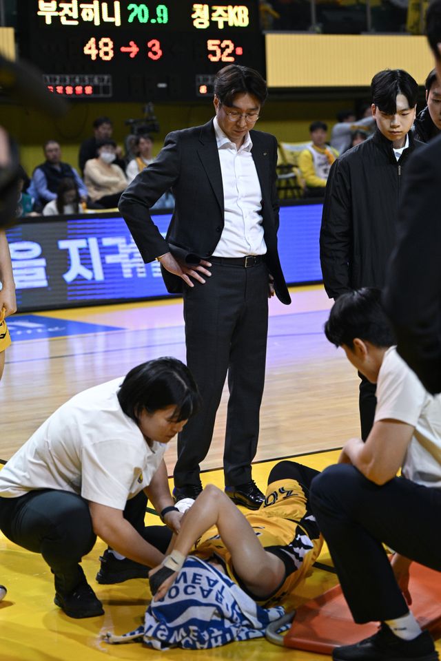 기록과 승리에도 김완수 KB 감독은 마냥 웃지 못했다. 경기 종료 후 취재진과 만난 김완수 감독은 "승리는 했지만, 윤정이의 부상이 나와 기뻐할 수만은 없다"고 아쉬움을 전했다. 이날 18분 50초를 뛰면서 중요한 때 바스켓 카운트와 공격 리바운드를 따내며 팀에 헌신한 그는 3쿼터 종료 20.9초를 남겨놓고 골밑에서 이시다 유즈키와 어깨를 부딪혔다. 충돌 후 통증을 참지 못하고 누운 그는 결국 들것에 실려가며 이날 출전을 마쳤다.