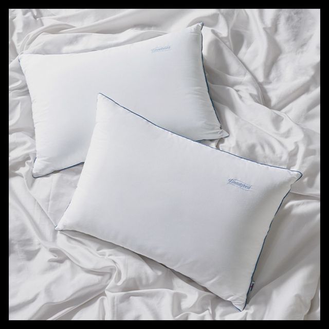 베개 속 스프링이 안정감 있게 목을 잡아주는 화이버 포켓스프링 필로우와 고밀도 메모리폼의 비스코스프링 윈더 필로우.설 선물로 제안한다. 문의 1899-8182