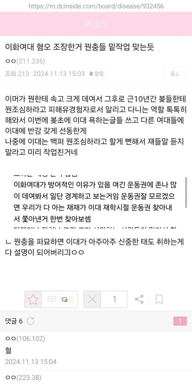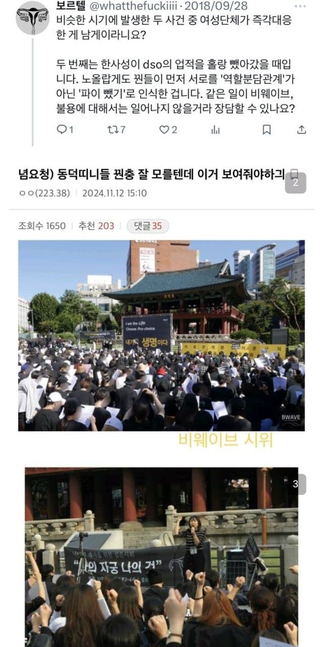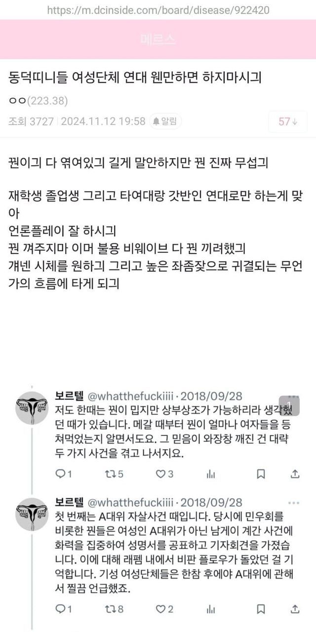 반대로 운동권에선 우리 덕에 페미들이 이정도 큰 거다 운동권 없으면 페미들 아무것도 아니라며 존나 싸우고 있노ㅋㅋㅋ