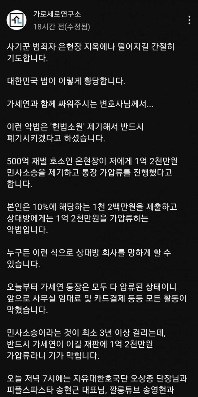 유튜브 수익이 막힌 가세연의 유일한 수입창구인 통장이 압류 되었다.