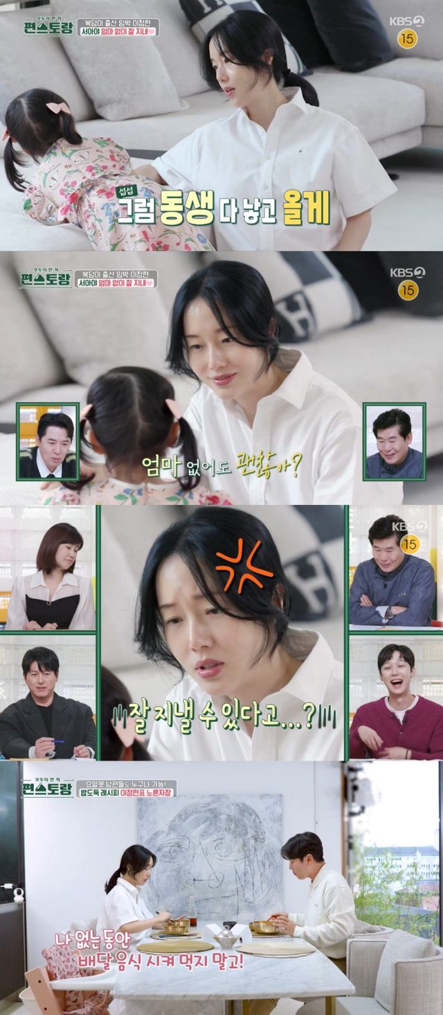 이날 만삭의 배로 등장한 이정현은 출산을 앞두고 산후조리원에 들어가기 위한 짐을 싸면서 출산이 임박했음을 알렸고, 출산으로 약 20일 동안 집을 비우게 된 이정현은 첫째 딸 서아에게 "아빠랑 혼자 잘 지낼 수 있어?"라고 걱정하기도 했다. 이에 서아는 "응!"이라고 즉답해 이정현을 서운하게 만들기도.