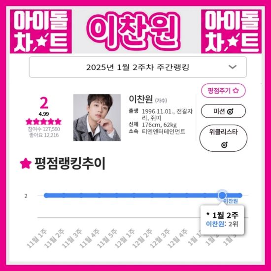 아이돌차트는 최근 이찬원이 2025년 1월 2주 차 평점 랭킹에서 127,560표를 받아 2위를 차지했다고 밝혔다.