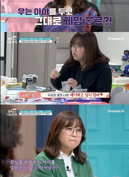그런가 하면, 금쪽이는 엄마와 게임하던 중 본인 마음대로 되지 않자 눈물을 터트렸다. 이에 금쪽이 엄마는 동요없이 "그만 하자"라고 철벽을 칠 뿐이었다.
