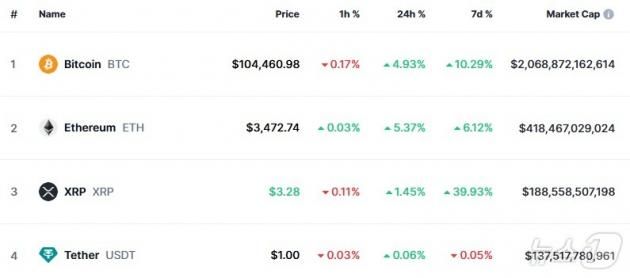 18일 오전 8시 기준으로, 글로벌 암호화폐 시세를 제공하는 코인마켓캡에 따르면 비트코인은 24시간 전보다 4.93% 상승해 10만4460달러를 기록했다.