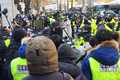 경찰은 오전 8시 12분께 “법원 정문 앞은 집회 금지 장소”라며 1차 해산 명령을 고지했으나 지지자들은 “1인 시위하러 왔다”며 항의했다.