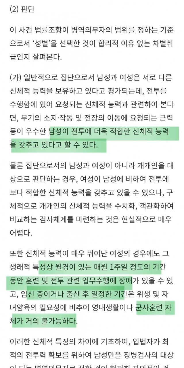결론: 모든 국민은 성별을 이유로 부당하게 차별받지 않을 권리가 있지만 20대 남성만을 잡아다가 1년 반동안 노예로 사용하는건 그닥 중대한 기본권 침해도 아닐뿐더러 어쩔 수 없는 일이다.