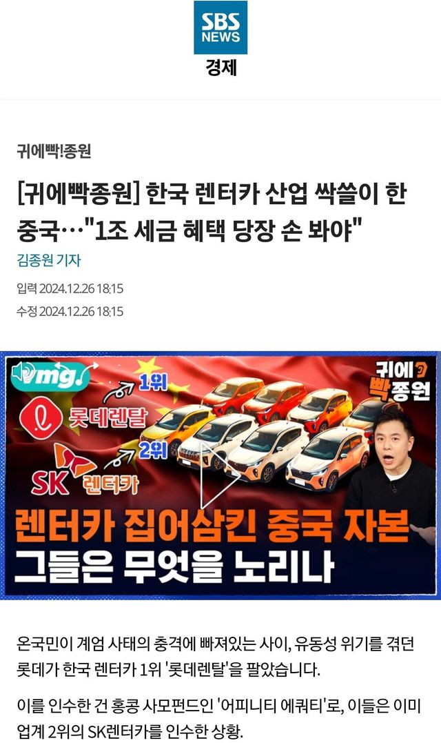 한국 렌터카 업체 1,2위 중국 자본이 인수