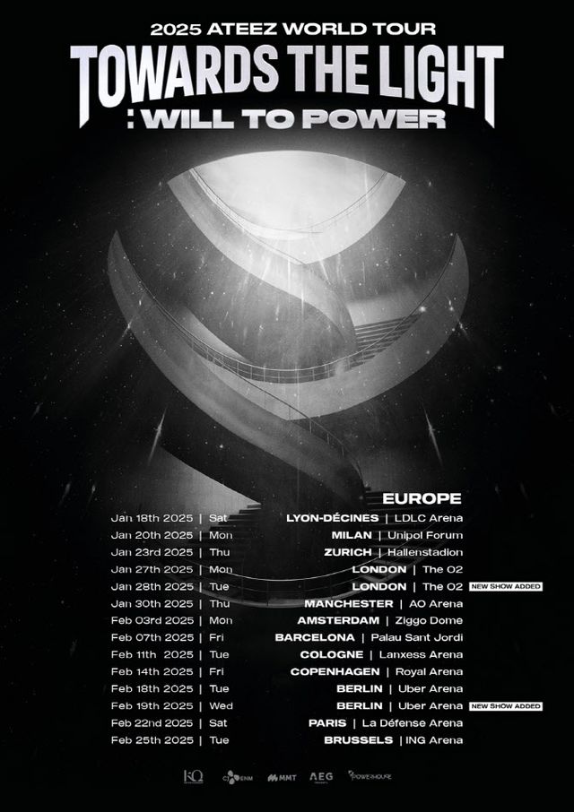 한편, 에이티즈는 유럽 투어 이후 3월 22일과 23일 양일간 서울 올림픽공원 KSPO DOME(구 체조경기장)에서 ‘’투워즈 더 라이트 : 윌 투 파워‘ 피날레 인 서울(’TOWARDS THE LIGHT : WILL TO POWER‘ FINALE IN SEOUL)’로 2025 월드 투어의 대미를 장식한다.