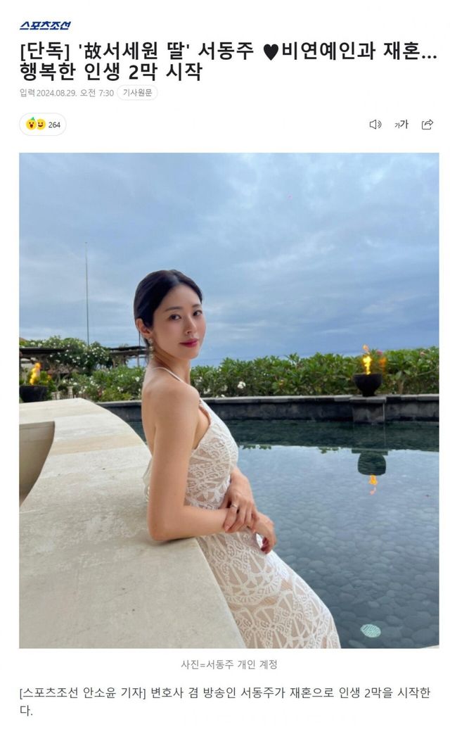 스포츠조선 취재 결과, 서동주는 오는 2025년 6월 29일 서울 모처에서 비연예인 연인과 결혼식을 올린다. 결혼식은 신랑과 가족들을 배려해 양가 가족들과 가까운 친척들만 초대해 비공개로 진행할 예정이다.
