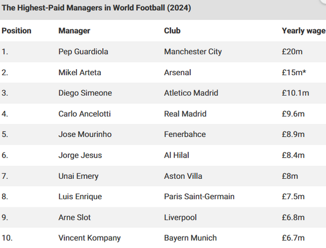 2024년 11월 기준 전세계에서 가장 많은 연봉을 받는 감독은 맨체스터 시티를 지휘하는 펩 과르디올라다. 그 전까지 로베르토 만치니가 사우디아라비아를 이끌 때 전세계 '연봉 킹'이었으나 사우디에서 경질된 후 그 자리를 과르디올라에게 넘겨줬다.