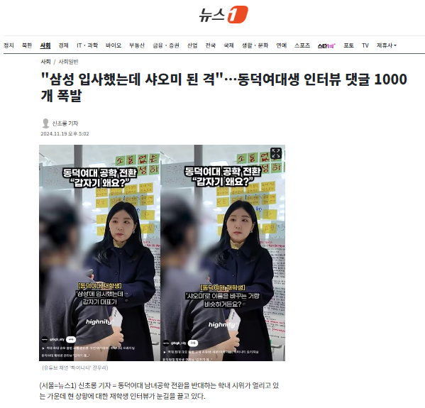 지난 12일 유튜브 채널 '하이니티'에는 학내 농성 중인 재학생의 인터뷰 영상이 올라왔다. 재학생은 이번 논란에 대해 "우리는 여대로 알고 입학했는데 이건 약간 입시 사기"라고 말했다.