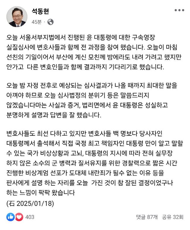 18일 윤 대통령 측 석동현 변호사는 개인사회관계망서비스(SNS)에 “변호사들도 최선 다하고 있지만 변호사들 백 명보다 당사자인 대통령께서 출석하셔서 국정 최고 책임자인 대통령만이 알고 말할 수 있는 국가 비상상황과 고뇌 등을 판사에게 설명 하는 자리를 오늘 가진 것이 참 잘된 결정이었구나 하는 느낌이 팍팍 왔다”고 밝혔다.