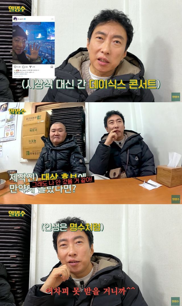 제작진은 "왜 시상식에 안 갔냐"고 질문했고, "일단 데이식스와 선약이 있었다"며 "영케이가 초대를 해줬는데 시상식 날이랑 겹쳤다"고 말했다. 이어 "상을 못 받을 것 같더라고"라면서 시상식에 불참한 웃픈 이유를 솔직하게 밝혔다. 이에 제작진은 "대상 후보에 만약 올랐다면 (시상식에 갔을 거냐)"고 물었고, 그는 "그래도 난 안 갔을 거 같아, 못 받을 거 아니까"라고 말하며 웃었다.
