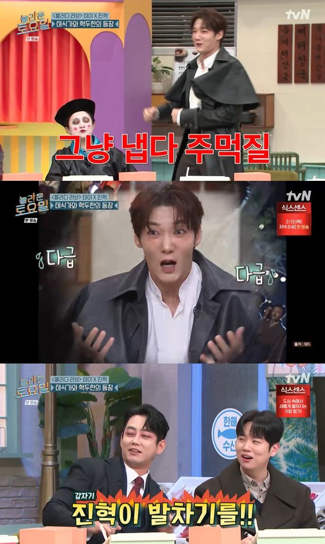 18일 tvN '놀라운 토요일(놀토)'은 테이와 최진혁이 출연한 '오싹오싹 러브러브 특집' 콘센트로 진행됐다. 이에 신동엽은 '행복 전도사', 피오와 넉살은 '뱀파이어', 한해는 '러브 액츄얼리'의 '휴 그랜트', 키는 '스위트홈'의 '송강', 박나래는 '강시', 김준현과 태연, 이동현은 'S.E.S'로 분했다.