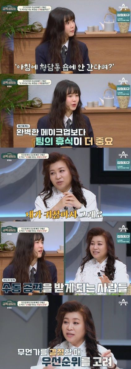 오은영은 "첫 번째 걸리는 건 혜선 씨가 '내가 메이크업을 청담동에 가서 안 받는 건 내가 귀찮아서 그래요' 하면 아무 문제가 안됐을거다. '한 시간이라도 더 잘래요'하면 아무 문제가 안되는데"라며 "직원분들을 고려한 건 좋은데 그걸 앞에 내세우면 그렇게 안 하는 나머지는 고려하지 않는 사람이 돼버린다. 그렇게 안 하는 사람들은 반대 입장에 서게 된다"라고 말했다.