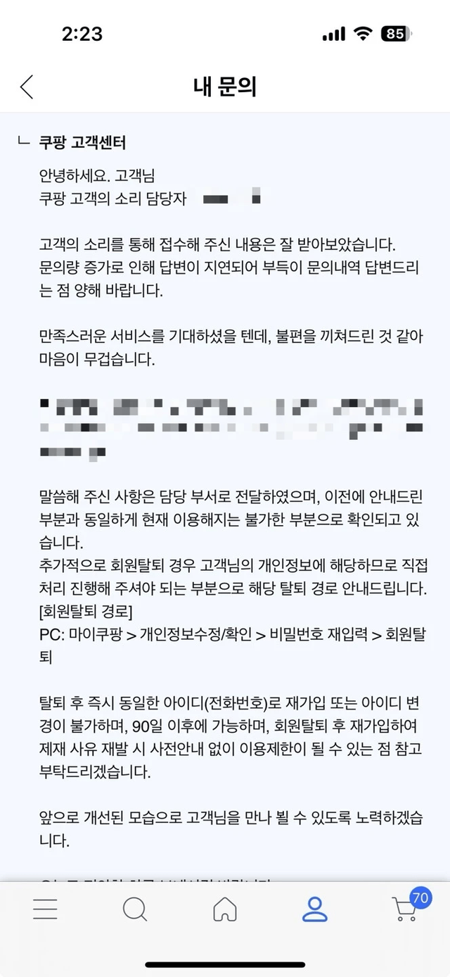 5. 사진 보내고 이용정지 풀어달라 문의했지만 이젠 답변도 없이 완료처리해버리고 매크로 문자만 온다고함