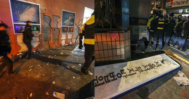19일 새벽 서울 마포구 서울서부지방법원에 윤석열 대통령에 대한 구속영장 발부 소식에 격분한 윤 대통령 지지자들이 난입해 유리창과 법원 건물 벽면 등을 파손한 흔적이 남아 있다. / 뉴스1
