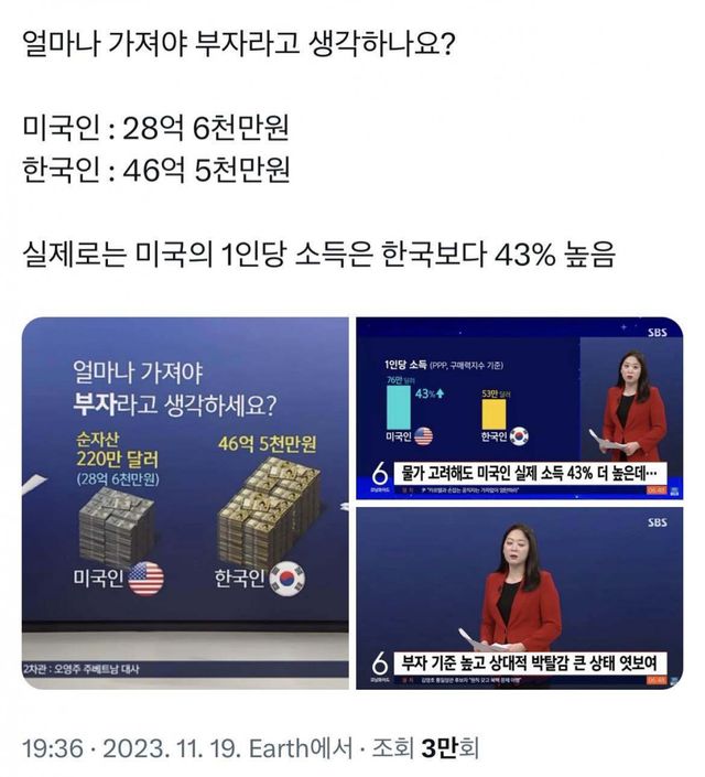 우리나라 사람들이 부자를 46억 5천만원 이상은 가지고 있어야 한다고 생각하는데,