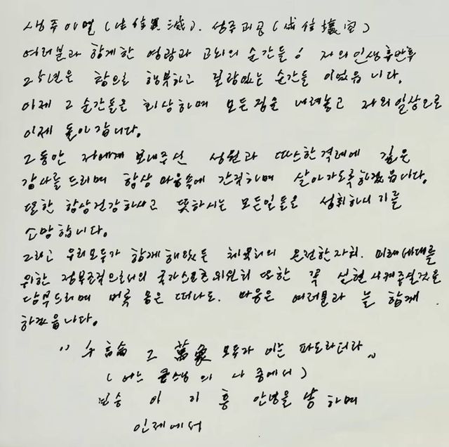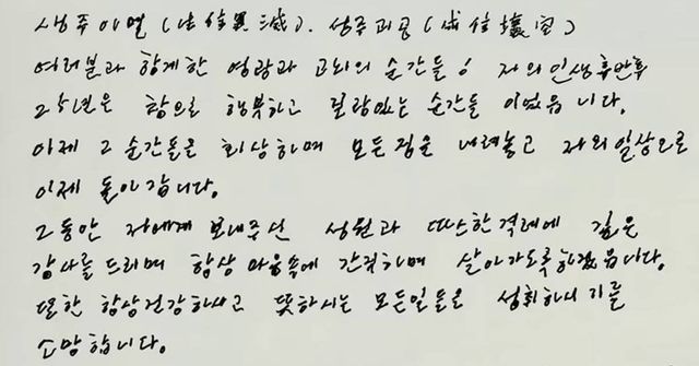 이어 “그동안 제게 보내주신 성원과 따스한 격려에 깊은 감사를 드리며 항상 마음속에 간직하며 살아가도록 하겠다”며 “또한 항상 건강하시고 뜻하시는 모든 일들을 성취하시기를 소망한다”고 적었다.