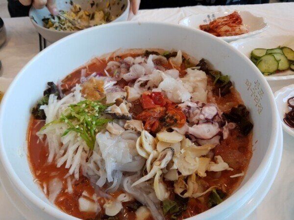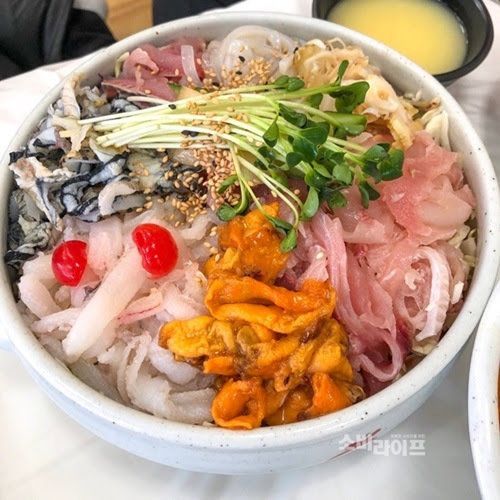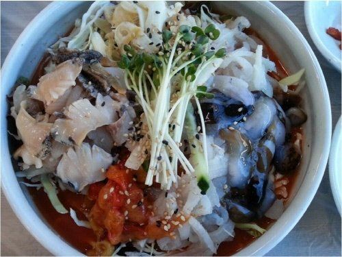 물회.생선회를 초장 얼음 육수에 넣고 각종 해산물, 채소에 곁들여 말아먹는것에 쇼크