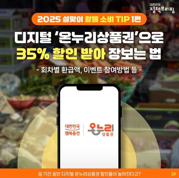국민들의 장보기 부담을 덜기 위해 설 기간(1.10.~2.10.) 동안 디지털상품권 할인율을 기존 10%에서 15%로 높입니다.