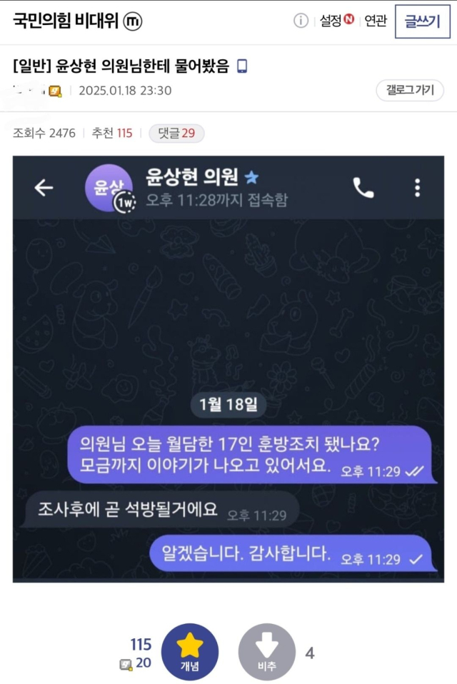 이에 윤 의원은 역시 "조사 후 곧 석방될 거예요"라고 답했다.