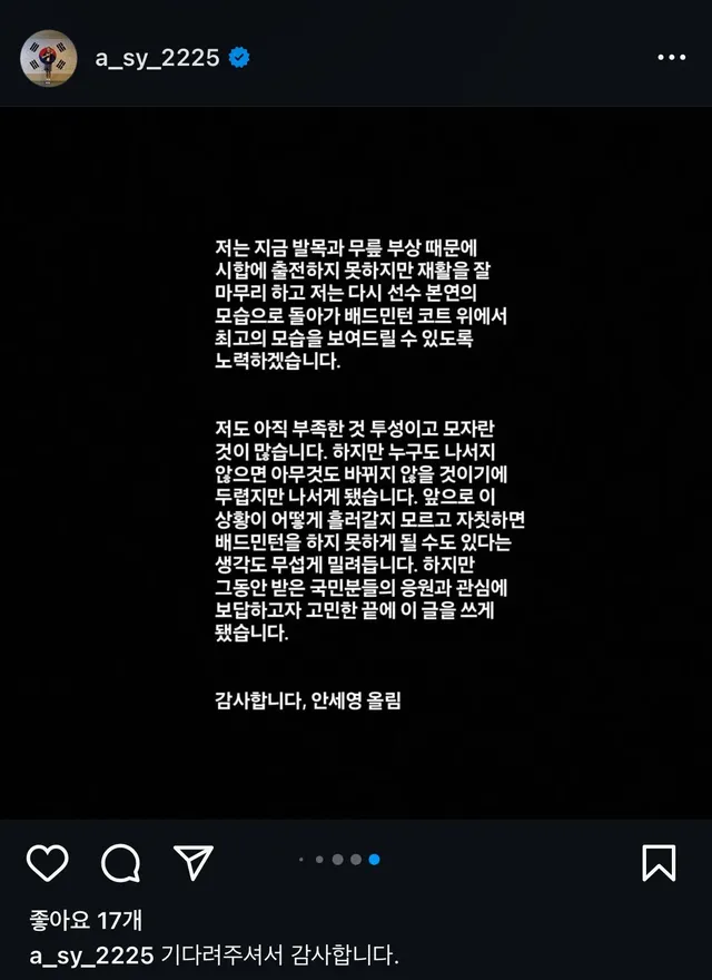 실시간 안세영 인스타 업로드