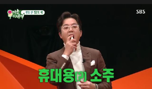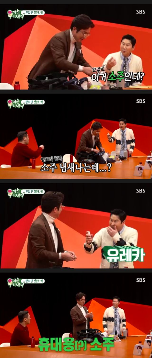 거기다 정준호는 스프레이 공병을 꺼내며 "뭔지 아냐"고 물었고, 신동엽이 직접 뿌려본 후 냄새를 맡더니 "이거 소주다"며 놀라움을 감추지 못했다.