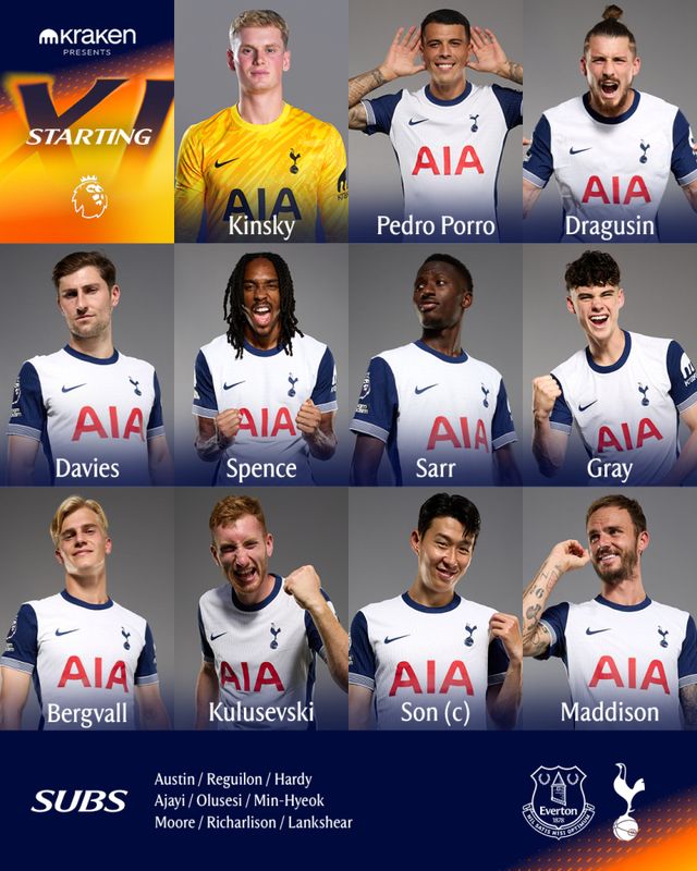에버턴전에 나설 토트넘의 선발 명단이 공개됐다. 캡틴 손흥민이 선발로 나서고, 양민혁은 공식전 3경기 만에 교체 명단에 이름을 올렸다.