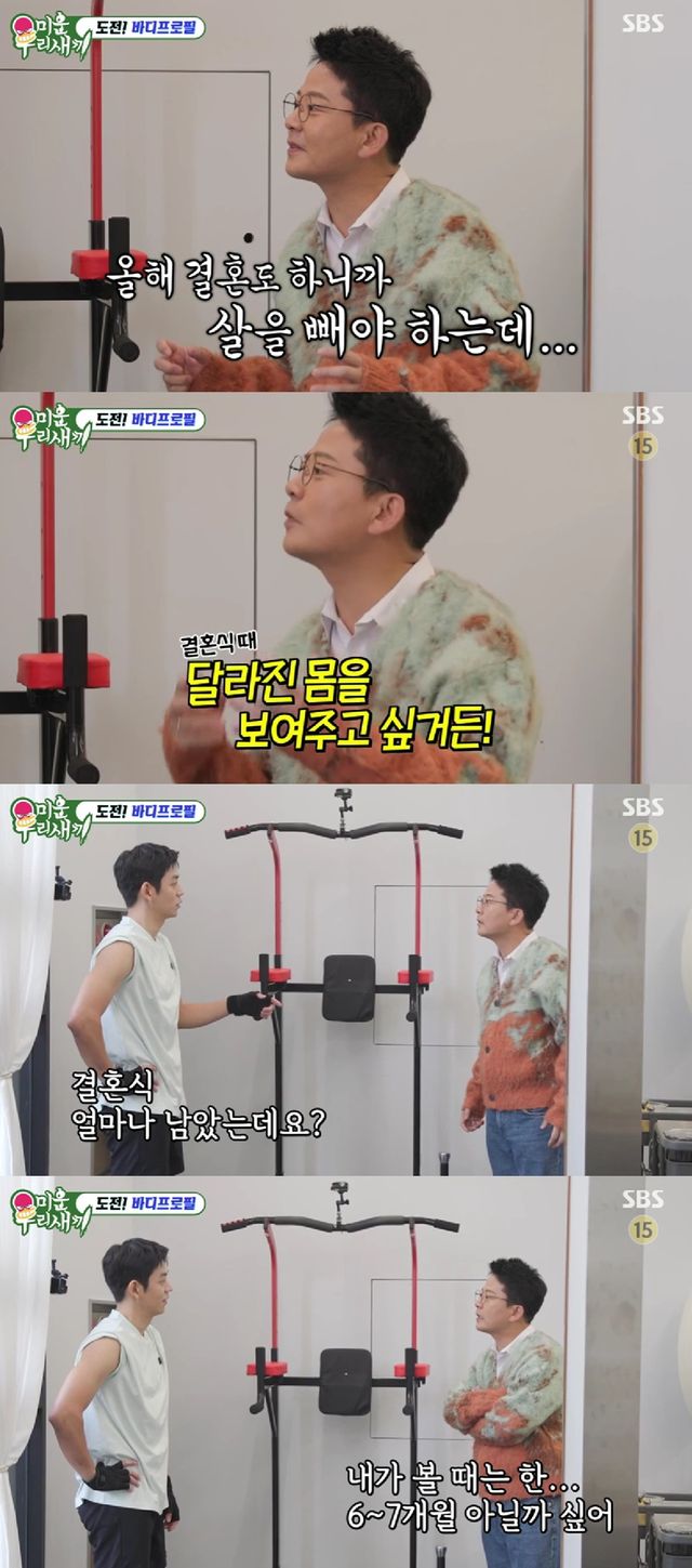 이용대는 바디프로필을 위해 두 달 동안 무려 7kg을 감량했다고. 김준호는 "내가 건강검진을 했는데 콜레스테롤 수치가 높아서 (병원에서) 10kg를 빼라고 한다"며 "나도 이제 결혼을 해야되니까 그 전에 달라진 몸을 결혼식장에서 보여주고 싶다"고 포부를 보였다.