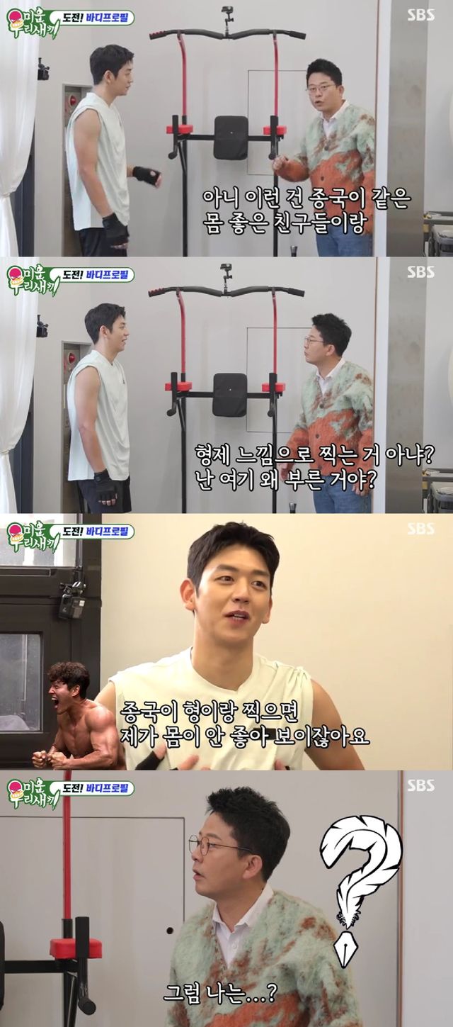 이어 사진 스튜디오에 등장한 김준호는 "바디프로필은 좋은데 이런 건 종국이 같은 몸 좋은 친구들이랑 형제 느낌으로 찍는 거 아니냐. 나는 왜 불렀냐"고 의아함을 드러냈다.