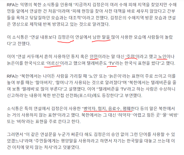 본인은 주민, 어르신, TV, 병약자, 험지, 음료수, 폄훼라는 남한말 사용해서 북한 주민들이 놀랐다고 함