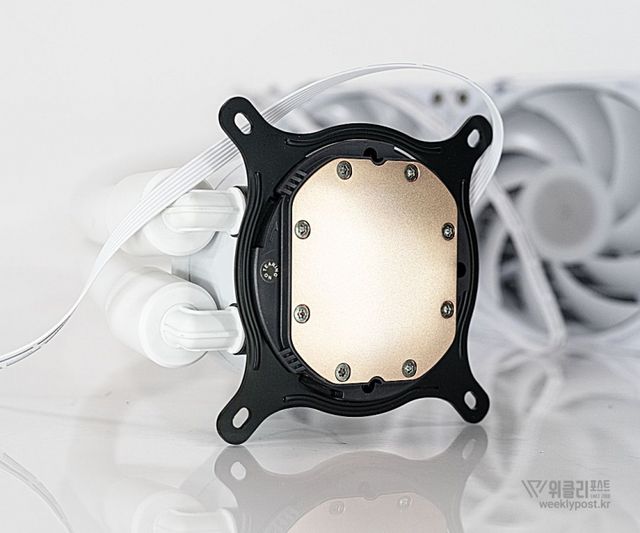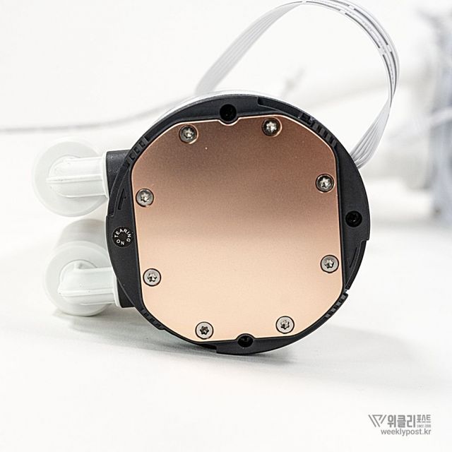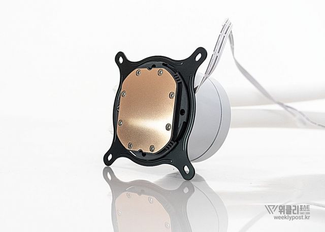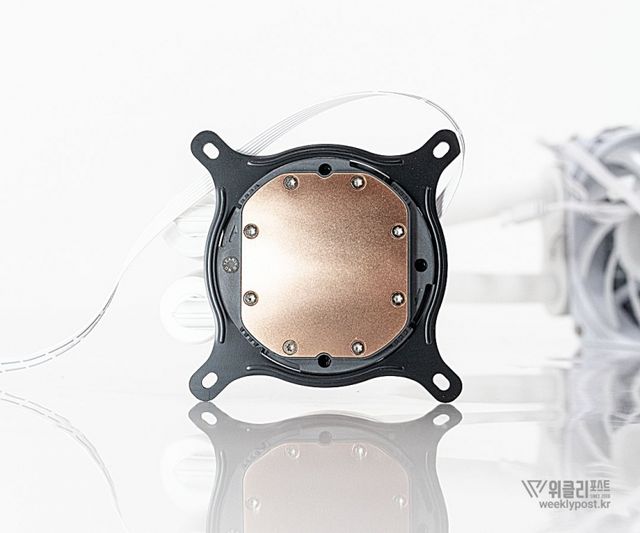 첫 번째 개선점은 워터블럭의 설계 변화다. ICEFULL 360 ARGB는 전작 대비 넓어진 순도 100%의 구리 베이스를 적용했다. 냉각수와의 접촉 면적이 확대됨으로써 더 많은 열을 효율적으로 분산시킬 수 있게 되었다.