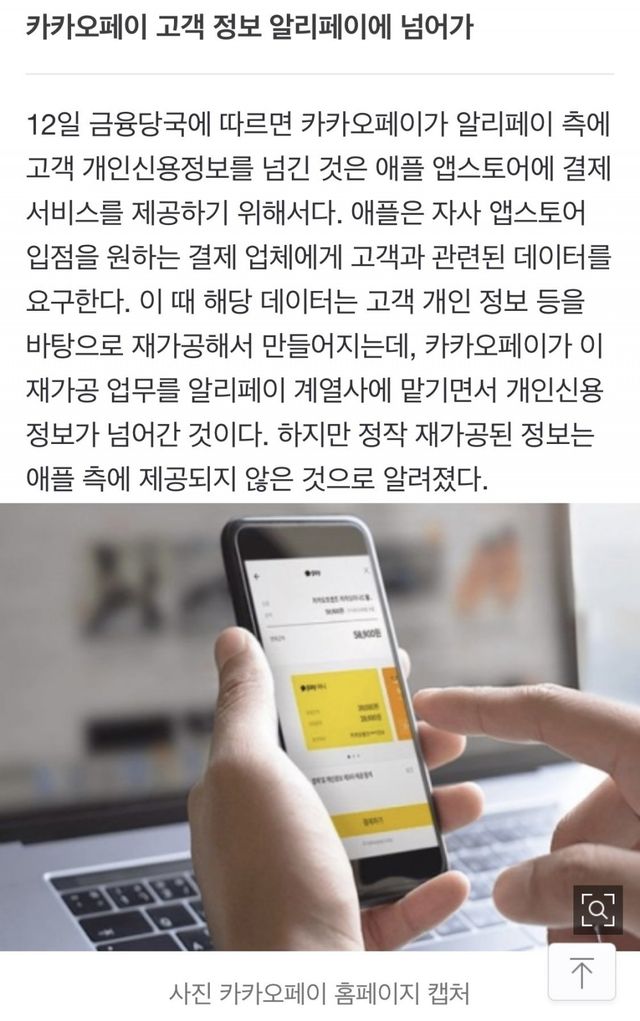 카카오페이가 개인신용정보를 제공한 배경에는 지배구조와 연관이 있다는 분석도 나온다. 카카오페이의 2대 주주는 지분 32.06%를 보유한 ‘알리페이싱가포르홀딩스’다. 알리페이싱가포르홀딩스는 앤트그룹의 알리페이 관련 계열사다. 또 카카오페이는 알리의 글로벌 모바일 결제 서비스인 ‘알리페이플러스’의 초창기 파트너로 국내 고객의 해외 결제뿐 아니라 해외 알리페이 고객의 국내 결제까지 지원하고 있다.