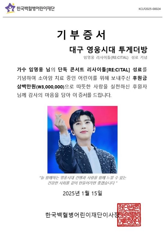 한국백혈병어린이재단은 최근 임영웅 팬카페 '대구 영웅시대 투게더방'으로부터 기부금 300만 원을 전달받았다고 밝혔다.