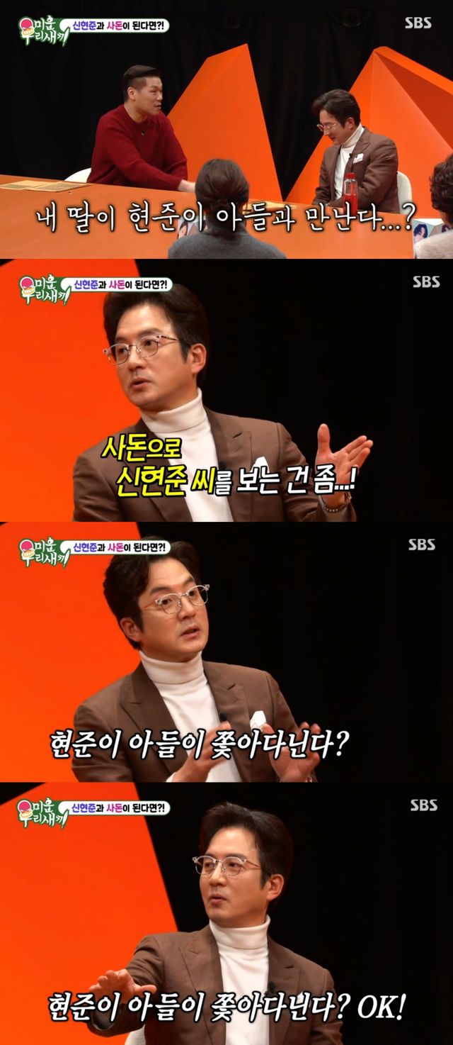 계속해서 서장훈은 정준호의 딸과 신현준의 아들이 어른들 모르게 사랑하게 됐을 때를 가정했다. 이를 듣자마자 웃음을 터뜨린 정준호는 고개를 푹 숙이면서 책상을 두 손으로 내리쳐 모두를 빵 터지게 했다.