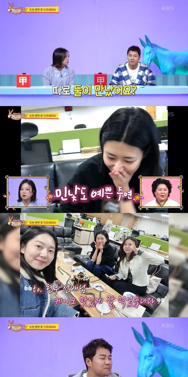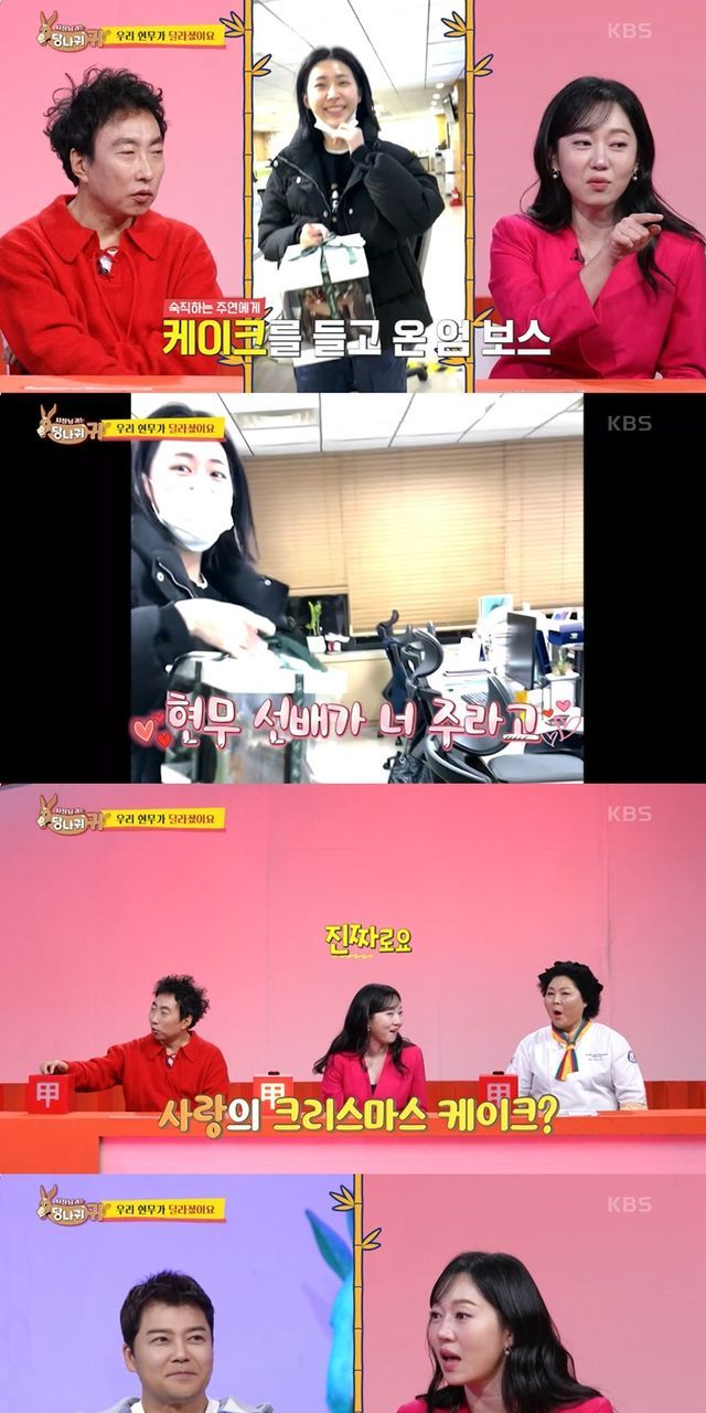 엄지인은 "현무선배가 너 주라고 해서 가져왔다"고 고백했다. 그는 "갑자기 제작진에게 연락받았다. 회사에 현무 선배가 케이크 가져다 놨다고, 홍주연 아나운서가 그날 당직이니 가져다주라고 했다더라. 그날 당직도 알고있었다"고 전했다.