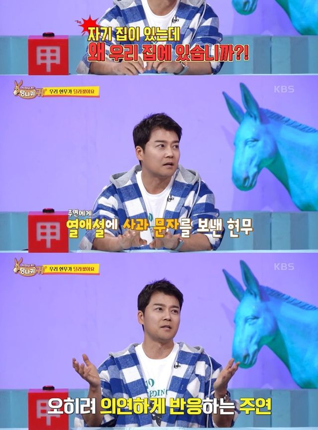 박명수는 "집에서만 보다가 여기서 보니깐 어떠냐"며 홍주연과 열애를 의심하는 질문을 던졌다. 이에 전현무는 "자기 집이 있는데 왜 우리 집에 있습니까"라며 "자꾸 (열애설)기사가 나니까 너무 미안하다고 문자를 보냈다. 너무 스트레스 받지 않냐고 하니까 자기는 전혀 상관 없다고 하더라"며 사적으로 연락한 내용도 전해 눈길을 끌었다.