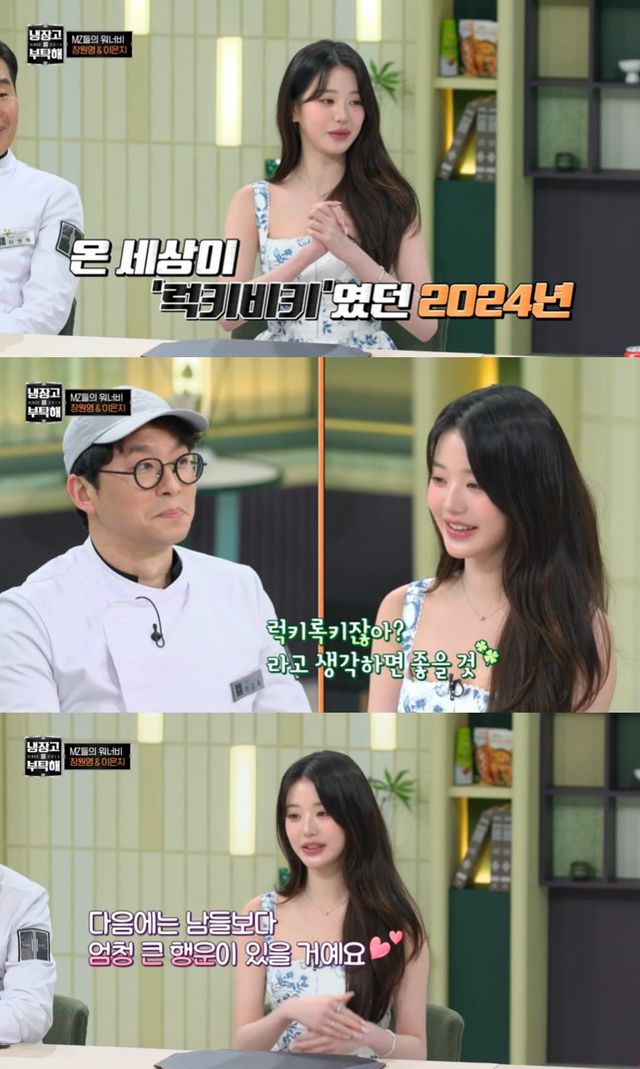 또 이날 장원영은 지난 2024년 그녀가 사용해 화제가 된 '럭키비키' 밈에 대해서도 언급했다. '럭키비키'는 럭키(Lucky)+비키(장원영 영어 이름)로, 긍정적 사고방식을 의미하며 '원영적 사고'라고도 불린다.