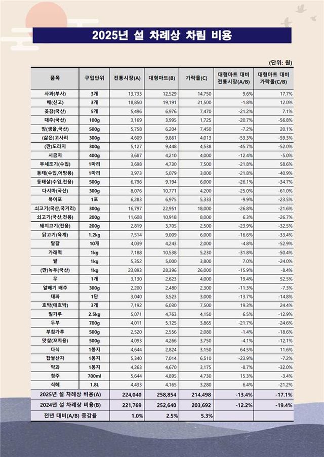 서울시농수산식품공사(사장 문영표, 이하 공사)는 설 명절 장보기에 도움이 되는 정보를 시민에게 제공하고자 서울시 내 대형마트, 전통시장, 가락시장(가락몰) 총 25곳을 대상으로 진행한 ‘설 차례상 차림 비용(이하 구매비용)’ 조사 결과를 발표했다.