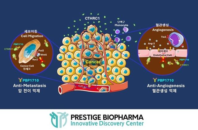 특히 세포 수준에서CTHRC1 표적 항체는 고형암에서 암세포의 이동 및 침윤을 약 45% 이상 억제함을 확인한 바 있으며, 이를 토대로 프레스티지바이오파마 혁신신약연구원(IDC)은 PBP1710의 전임상 연구를 진행하고 있다.
