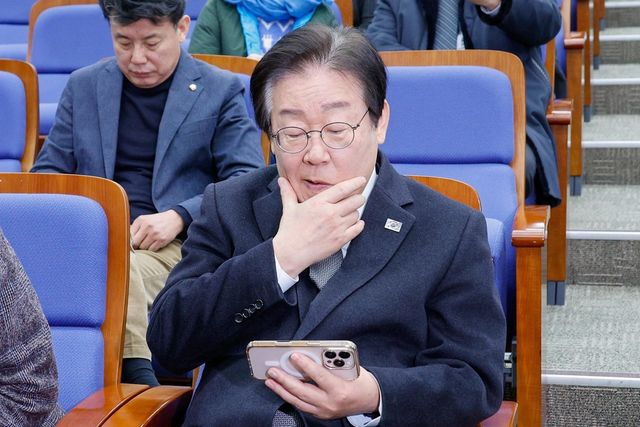 이재명 더불어민주당 대표가 19일 오후 서울 여의도 국회에서 열린 비상 의원총회에 참석해 휴대전화를 확인하고 있다. / 뉴스1