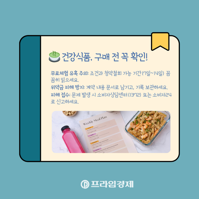 건강식품 피해는 무료체험을 미끼로 소비자를 유인한 뒤 과도한 위약금을 부과하거나 청약철회를 거부하는 경우가 흔하다. 특히 고령층 피해가 빈번하기 때문에 구매 전 계약 내용을 꼼꼼히 확인하고, 청약철회 기간(통신판매 7일, 방문판매 14일)을 숙지해야 한다.