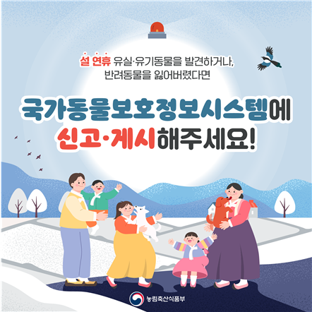 [컨슈머뉴스=이태림 기자] 농림축산식품부와 전국 지자체는 설 연휴(1.27.~1.30.)에 빈틈없는 유실·유기동물 구조를 위해 유실·유기동물 제보 및 반려동물 분실 신고 서비스를 제공한다.